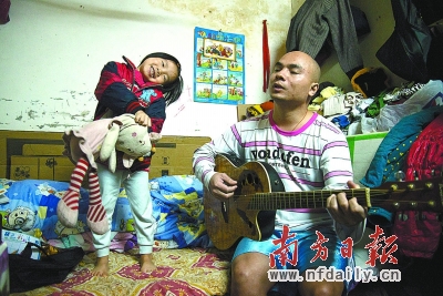 他颤抖着拨动手中的吉他,歌曲是他为女儿创作的《开心的娃娃》。