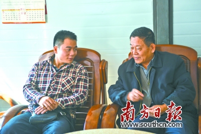 驻村“第一书记”黎文辉(左)到村民家里了解情况。 南方日报记者 王昌辉 摄 |