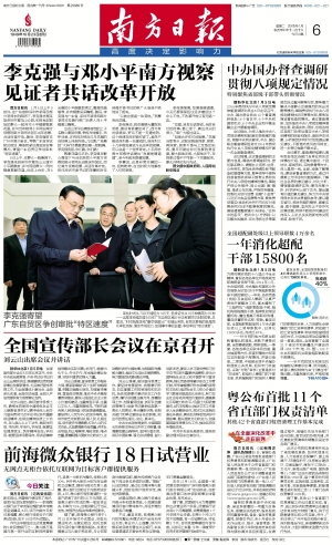南方日报讯 1月5日上午9时许,在广东省和深圳市领导及部分老同志的陪同下,李克强总理来到深圳市莲花山公园,和自发到现场的群众一起向邓小平铜像敬献花篮,并与当年陪同小平同志南方视察的部分老同志回忆当年场景,共话改革开放。随后,李克强前往广州市南沙新区,考察广东自贸试验区规划、筹备和新区简政放权等情况,寄望广东自贸区争创审批“特区速度”。