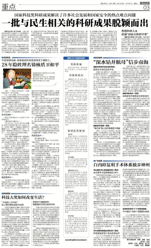新华社北京1月10日电 记者从国家科技奖励办公室获悉,10日获得国家科技奖的许多科研成果以民众需求为导向,解决了一批事关国计民生、社会发展和国家安全的热点、难点和关键问题,一批有代表性、与百姓生活紧密相关的科研成果脱颖而出。