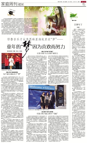 最终,这个拥有丰富阅读经历、思考深度以及对世界充满好奇的女孩,获得了耶鲁大学全额奖学金并在她高二时提前被录取。这次,她不是以艺术生的身份去学音乐,而是像其他顶尖高手一样,去接受通识教育。现在,她正在读音乐和国际关系双专业,未来,她说,“想为跨文化交流做点事。”