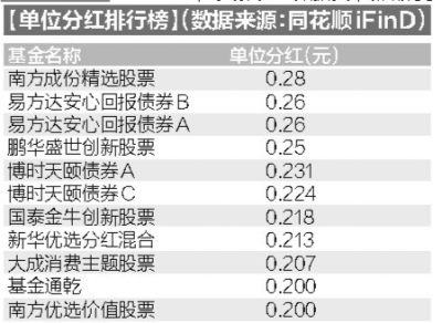 此外,分红总额暂时排名第二和第三的是兴全趋势和博时主题,规模分别是8.6亿元和8.13亿元。目前,每10份分红超过2元的基金还有博时天颐债券、国泰金牛创新、新华优选分红、大成消费主题和基金通乾。业内人士表示,每年一季度是公募基金分配去年收益集中时段,在去年赚钱效应刺激下,还将有许多基金陆续分红。
