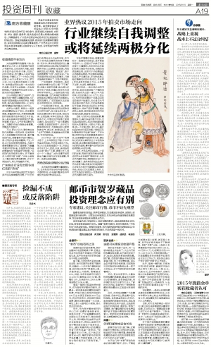 2014年这一波“冷空气”来得太急了,上半年表现还不错,下半年资金突然告急,市场有点措手不及。而2015年是有准备的一年,市场应该不会太令人悲观。而且,新进场的企业家“胃口”不错,通常三五人成立一个“小基金”,成为支撑市场的新生力量。拍卖行业在自我调整,寻找一条更合适的道路。