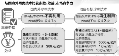 创新点之一是河蚌植核培育新技术。“我们经过反复试验,革命性地改变了河蚌外套膜培育‘无核珍珠’的模式,让外套膜和内脏囊都能培育出‘有核珍珠’。”