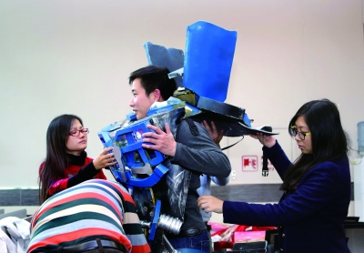 “机器人”在队友的帮助下才能穿戴笨重的盔甲。 |