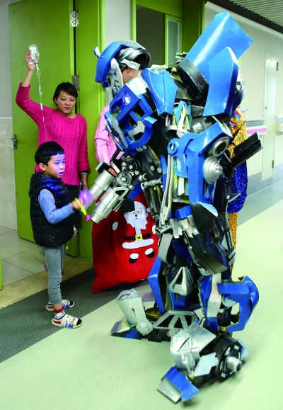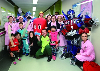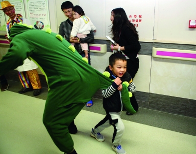 当各种卡通造型出现时,整个医院大堂马上沸腾起来,等候的小孩和家长都围着“小丑医生”合影拍照。 |
