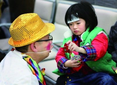 2014年12月18日,“小丑医生”出现在省妇幼保健院输液区,这一下子吸引了孩子们的注意。头上还贴着发烧退热贴的贝贝从妈妈身边走过来,大眼睛直盯着这个“神奇”的叔叔看。这个拿着玩具为孩子变魔术的人,正是由该院儿科医生唐远平扮演的“小丑医生”。