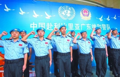 2013年7月16日,中国赴利比里亚广东维和警队出征仪式上维和警察向祖国宣誓。曾强 摄 |
