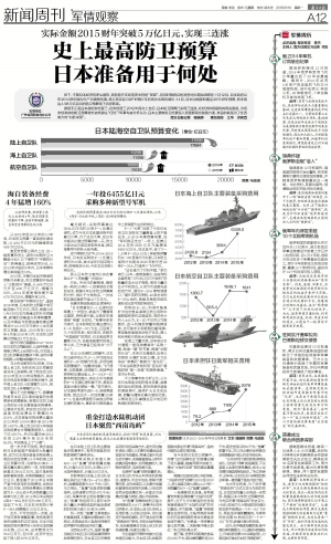 时下,不管日本经济有多么疲软,其防务开支却前所未有的“坚挺”。仅仅时隔两日的消息对比是如此鲜明:1月12日,日本政府公布2014财年国内生产总值预估值,显示其实际GDP时隔5年后再次出现负增长;14日,日本内阁旋即通过2015财年预算,其中高达4.98万亿日元的防卫预算创下历史新高。