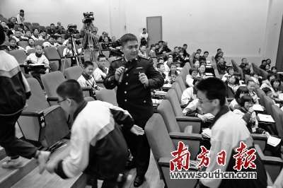 短短45分钟的示范课,学生们不断与民警互动,现场气氛活跃。法制课内容既有“网络诈骗”“低俗网站”“网络谣言”“网络暴力”等文明上网引导,又有“性侵应对”“踩踏自救”等时下热点。课堂针对踩踏事件专门设置了模拟演练环节,设定了在地震疏散拥挤的情境里对流逆行和有人摔倒的两个情形,直观生动地讲解了发生踩踏事件时的应对和自救技巧。主讲民警范绍祯利用视频、图片、情景模拟等多形式的创造性的教学方式,用诙谐活泼的语言、新鲜热辣的案例充分调动学生的积极性,使学生在时而会心欢笑、时而蹙眉沉思的课堂中接受法制教育。