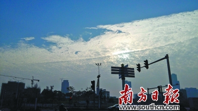 冬日里,天空中出现这种冷暖空气锋面交汇形成的透光高积云现象,颇为罕见。南方日报记者 梁维春 摄 |