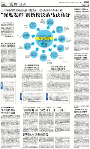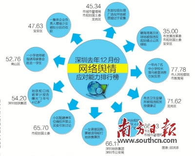 19日,深网舆情工作室发布了去年12月网络舆情应对能力排行榜,小区停车位确权、市民跳广场舞等民生热点事件集中上榜。其中,凭借在中小学校长密集落马事件中良好的舆情引导能力,深圳市检察院、教育局两单位荣登排行榜冠军。