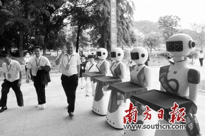 | 本月开幕的世界莞商大会上,开胜电子的礼宾机器人惊艳亮相,让与会莞商感受到东莞智造的魅力。南方日报记者 孙俊杰 摄 |