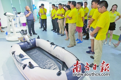 | 讲解员在松山湖国际机器人产业基地向参观的企业家介绍逸动科技的电动船。 南方日报记者 孙俊杰 摄 |