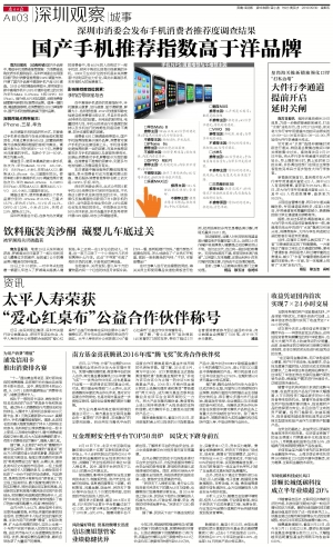 南方日报讯 (记者/孙颖)国内外品牌中,哪些手机消费者推荐度高?为消费者选购优质手机提供指引,深圳市消委会运用国际通行的对消费者推荐度(NPS)调查方法,开展了国内外品牌中高端手机产品NPS调查。29日公布的调查结果显示,使用率前8款中高端手机中,NPS分值排名前三的分别为华为Mate 8、iPhone 6和OPPO R9(Plus)。据介绍,NPS排名越前,说明消费者越愿意向亲朋好友推荐该品牌。值得一提的是,调查数据表明,在消费者的NPS口碑推荐中,国产手机的推荐指数高于国外品牌。