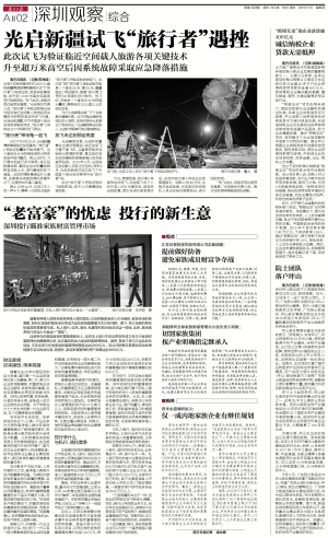 南方日报讯 (记者/苏梓威)光启9日晚在离深圳约4500公里的新疆博湖县博斯腾湖乡试飞“旅行者”2号验证版,因系统故障受挫,在升至11000米高空后紧急进行地面回收。“放飞成功,但是没有达到预定高度。”光启相关负责人说。“旅行者”2号验证版是光启为验证临近空间载人旅游各项关键技术研制的临近空间飞行器。光启此前透露,作为中国首个临近空间旅游服务项目,“旅行者”2号将在2017年择机放飞测试。