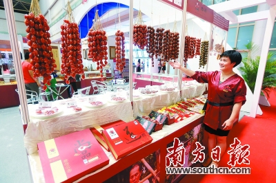 | 吕衬婵带着30多个品种的腊肠参加2014年东莞文博会。 |