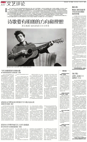 同时,我还认为,诺贝尔奖在此时颁给鲍勃·迪伦还有更深的含义,因为眼下正是世界经济陷入低谷,国际局势十分微妙,甚至一些地区已经火药味十足,我觉得评奖者其实是重新让人们审视鲍勃·迪伦那些留在历史上和一代人心中的反战诗作(歌曲),以史为鉴,警醒世人。