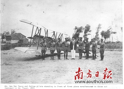 | 杨仙逸(穿西装者)身后是他设计、制造的中国第一架飞机,他的精神仍激励着后人。杜利威 供图 |