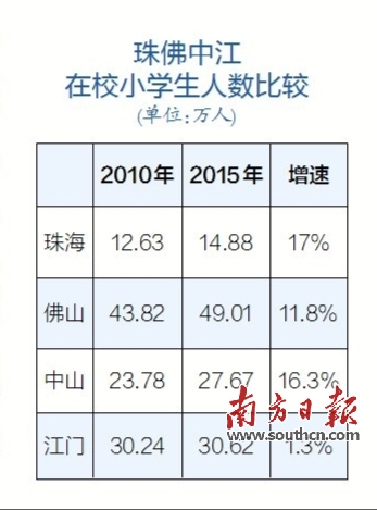 对比珠海、佛山、中山、江门四座城市从2010年到2015年五年的在校小学生数据变化,可以发现,珠海的在校小学生在四市中增速最快,正在赢得更多的增量人口。但是,增速的高企难以掩盖总量上的短板。