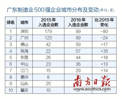 2016年,广东制造业500强入选企业数量排名第一的城市为深圳和广州,入选企业数量均为99家。而珠海入选企业数量位列佛山之后,高居全省第四把交椅,超越东莞、中山等传统制造业大市。