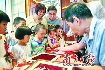 | 今年8月27日,在麦秆画体验活动现场,非遗传承人方志伟现场指导小朋友们制作麦秆画。受访者供图 |
