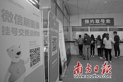| 深圳一市属公立医院内,关于自助挂号、微信刷医保的宣传展板十分显眼。 |