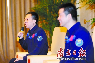 | 航天员景海鹏(左)和陈冬接受媒体采访。新华社发 |