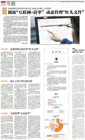 迄今为止,中山市已经完成了对市政府、49个职能部门以及24镇区共计2966件“红头文件”的清理。贯彻省委、省政府《实施纲要》,率先实施规章和规范性文件目录和文本动态化、信息化管理的重大改革创新,中山市创新地引入“互联网+”思维,建立行政文件数据库,实现对“红头文件”的线上“清单化”管理,为规范高效地管理行政文件、推进依法行政探索了新的经验。