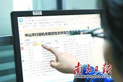 | 通过中山市行政机关规范性文件效力查询系统,市民可以一目了然地了解行政文件的“正面清单”和“负面清单”。王云 摄 |