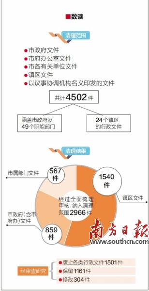 2014年,中山市委市政府全面启动行政文件清理工作。清理范围包括:市政府文件、市府办公室文件、市各有关单位文件、镇区文件、以及议事协调机构名义印发的文件,涵盖市政府及49个职能部门、24个镇区的行政文件,合计涉及文件4502件。