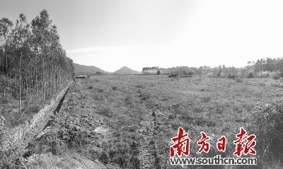 12月7日,记者在高北村看到,近千亩农田集中分布在河水一侧,连片平整,除了少部分种植香蕉,其余都已丢荒,杂草丛生。在河的上游,记者找到了被水冲毁的陂头,由于时隔多年,原址已不复存在。不过,通过残留的一角大致可以推测出原来的形状:陂头长约四五十米,高三四米,由巨石堆砌而成,将河水截断形成了一个水面高于下游农田的大水塘,然后通过水闸放水灌溉农田。