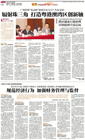 在北上广深四大一线城市格局中,广州、深圳这两大城市去年经济总量都超过1.9万亿元,并将在今年携手冲击2万亿元。广深双城如何成为粤港澳大湾区的发展“发动机”?这一话题引起代表们的关注。有人大代表建议,要重新打造广州、深圳与香港对接的创新轴,对珠三角其他城市进行有效扩散。