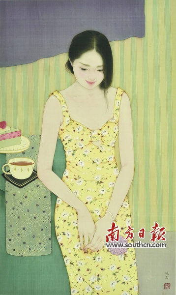 与许多“画点什么”的画家不同,何馥君的作品提示观众她是在“做点什么”。换言之,她的作画方式不是简单地将生活中的某些具体人物形象直接复制到画材上,有所选择地演绎某种心灵感应,并营造特定氛围的画面情景才是她的终极绘画目标。和那些过于陷入笔墨、理念、效果等纠缠不清的绘画术语泥沼里,因而远离了淳朴动人的艺术原点的当代艺术家不同,何馥君的绘画表现手法极其朴实简洁——她没有过多粘上当代工笔画坛风行的剪贴拼凑等习气,也正因此,其画面所洋溢的淳一和静美,在眼花缭乱的当代工笔作品群中便如乡间林泉般清澈。不知何故,何馥君的观察目光所及尽是周围的朋友,有时也自我审视:无论是《茶语》还是《答秋》,画中那些幽思、期盼、呆坐、闲谈的少女原型几乎都源于身边的朋友或画家本人。或许在艺术家的眼里,身边这些美丽的女性就像一面具有特殊倾向性的哈哈镜——将美无限描绘,乃至虚幻真实的突兀。如歌的场面中,被艺术化的人物散发出现实世界无法企及的遐想和梦幻,她们的所行所思寄挂淡淡的哀愁和无奈,而浅黄绿色调又将这种情愫推向极致。这些诗意清纯的生活状态,在当下急遽变动的科技信息社会中是否切实存在,可能并不在画家思索的范畴之内,她所努力的是将人物置放在理想的情节场面中,并精准捕捉其一闪而过的神情,进而展开一幅醉人心脾的温馨平实的生活画面。或者,这是一种更加高明雅致的艺术之道。