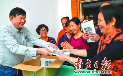 | “老虎仔”罗树明(左一)向老街坊赠书。 |