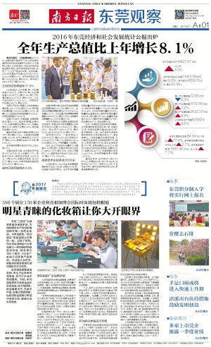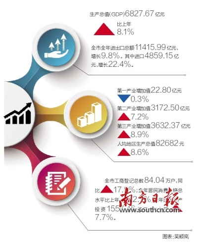南方日报讯 (记者/戴双城)4月10日,东莞市统计局发布了《2016年东莞市国民经济和社会发展统计公报》(以下简称《公报》)。《公报》显示,去年全市经济呈现出稳中有进、进中向好的良好态势,实现了“十三五”的良好开局。初步核算,2016年东莞生产总值(GDP)6827.67亿元,比上年增长8.1%。全市全年进出口总额11415.99亿元,增长9.8%。其中进口4859.15亿元,增长22.4%。