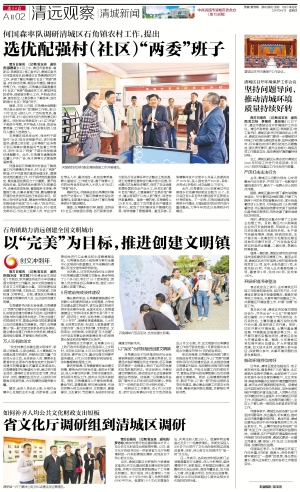南方日报讯 (记者/黄玉熹 通讯员/邵雅莉)12日上午,清远市委常委、高新区(燕湖新区)党工委书记、清城区委书记何国森率队到清城区石角镇调研农村工作,详细了解石角镇村(社区)“两委”换届、农村综合改革、美丽乡村建设、精准扶贫等工作。他提出,石角镇必须高度重视村(社区)“两委”换届选举工作,要坚持党的领导,细致做好群众工作,严明选举纪律,宣传到位,让更多群众了解选举,选优配强村(社区)“两委”班子。