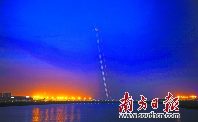 夜幕降临,深圳宝安国际机场各种颜色的信号开始闪烁,一架飞机离开跑道升入空中,在深蓝色的天幕上划出几条闪亮的光带,就像一条空中高速公路。 何俊 摄