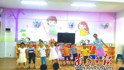 胡奕妃与孩子们手拉手表演。 |