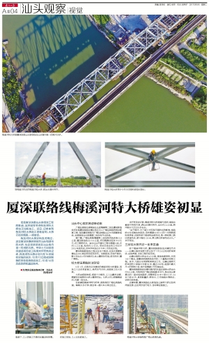 梅溪河特大桥穿梅溪河而过,这是厦深铁路联络线跨汕头和潮州的大桥,也是该联络线在汕头境内唯一跨河的大桥。中铁十六局项目经理部项目总工程师米怀军告诉记者,梅溪河特大桥计划9月15日钢桁梁拖拉就位,10月13日完成预制板的安装级桥面系施工,10月14日具备架桥机通过条件。