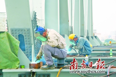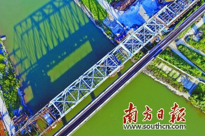 “由于跨河,为了减少对现有河道航运的影响,铁路桥中采用拖拉法架设,该桥需要69米×3的一河两跨钢桁梁拼装,目前桥梁下部结构全部完成,第一跨和第二跨已拼装完成,累计拖拉138米,第三跨已拼装完成60%。”米怀军说。