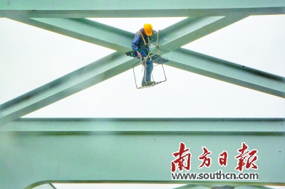 大桥由钢梁架起,钢梁十分锋利,工人头戴安全帽,需要在这些跨河大桥上攀爬作业。从桥上可以俯瞰梅溪河,风景一览无余。