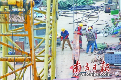 在施工现场,工人正加紧施工。 |