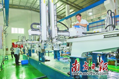 伯朗特智能装备公司就曾利用“新三板”进行定增募资。图为在伯朗特生产线上,工作人员正在调试机器人。南方日报记者 孙俊杰 摄 |