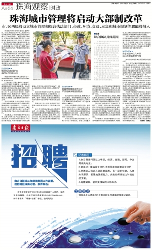 珠海城市执法体制改革迈出重要步伐。近日,珠海印发《关于深入推进城市执法体制改革改进城市管理工作的实施方案》(以下简称《方案》)。根据《方案》,珠海市、区两级政府城市管理领域将实行大部制改革,整合市政公用、市容环卫、园林绿化、城市管理执法等城市管理相关职能,统一规范机构名称,推进综合执法。《方案》规定,各级城管执法人员应当严格履行执法程序,改进执法方式,严禁随意采取强制执法措施。