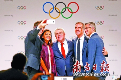 国际奥委会主席巴赫(右三)与巴黎市长伊达尔戈(左二)和洛杉矶市长加切蒂(右二)自拍庆祝。 新华社发 |