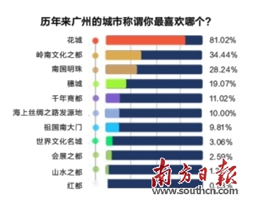 世界文化名都、穗城、南国明珠、千年商都、会展之都、山水之都……在广州历年来各种城市称谓中,哪个称谓最受公众欢迎?14日,由省社科院等单位组成的课题组发布了《广州花城城市品牌战略规划研究报告》(以下简称“报告”),报告指出“花城”这一称谓接受度最高,接受调查的市民中,81.02%的市民认为,花城是广州历年来各种城市称谓中最喜欢的名称。