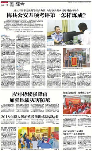 笑容的背后,是市民们满满的安全感。日前公布的2018年上半年全省群众安全感和公安工作满意度第三方调查结果中,梅州市综合考评获得全省第一名,而梅县区则取得了公安机关业务综合考评、群众对公安工作满意度等五项考评全市第一的好成绩。