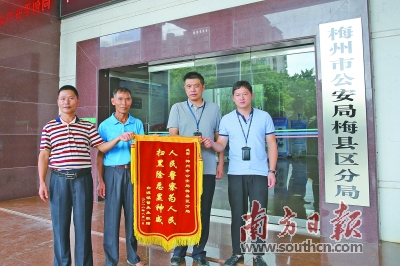接到许伯的报警后,梅县区警方结合“破小案”攻坚战工作,组织民警展开侦查,通过调查走访和调取相关监控视频,将两名广西籍嫌疑人一一锁定,并先后辗转广州、广西等地,于6月1日下午在韶关市一宾馆内将犯罪嫌疑人黄某堂(男,39岁)、蓝某飞(男,41岁,均广西梧州人)抓获,为许伯挽回了经济损失。