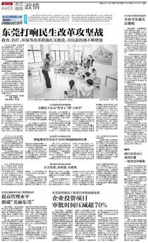 东莞人口结构特殊,实际常住人口近千万,与市民日益增长的需求相比,优化公共服务的任务繁重,供给不平衡不充分的矛盾十分突出。近两年来,面对教育、医疗、环保等民生改革的“硬骨头”,东莞坚持创新民生保障体制机制,一批改革措施纲举目张、扎实推进、落地生效,市民的获得感、幸福感不断增强,这些民生改革也成为东莞营商环境的“新名片”。